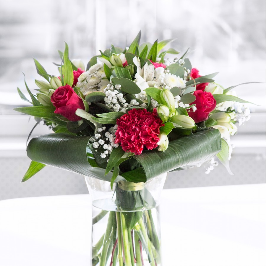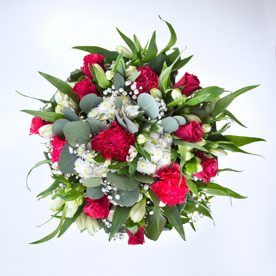 This exquisite bouquet blends sweet white chrysanthemums and delicate gypsophila with luxurious red roses and vibrant carnations. Finished with white alstroemeria and elegant aspidistra leaves, each bloom is thoughtfully arranged to create a harmonious and captivating display.